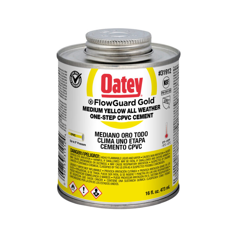 Le ciment jaune Oatey® FlowGuard Gold® 1-Step All Weather Fast Set est recommandé pour les systèmes d’eau froide et d’eau chaude jusqu’à 200 °F / 93 °C. Sa formule de prévention est conçue pour aider à protéger les tuyaux contre la corrosion. Sa formule de prévention est conçue pour aider à protéger les tuyaux de la corrosion. Son corps moyen possède d’excellentes propriétés de remplissage des espaces et est facile à appliquer grâce à la loupe incluse dans le couvercle. Cette colle jaune, à faible teneur en COV et à prise rapide peut être utilisée pour souder au solvant des tuyaux d’eau potable chaude et froide en CPVC et des raccords d’un diamètre allant jusqu’à 2 po avec ajustement serré. Les produits Oatey ont gagné la confiance des professionnels de la plomberie depuis plus de 100 ans.