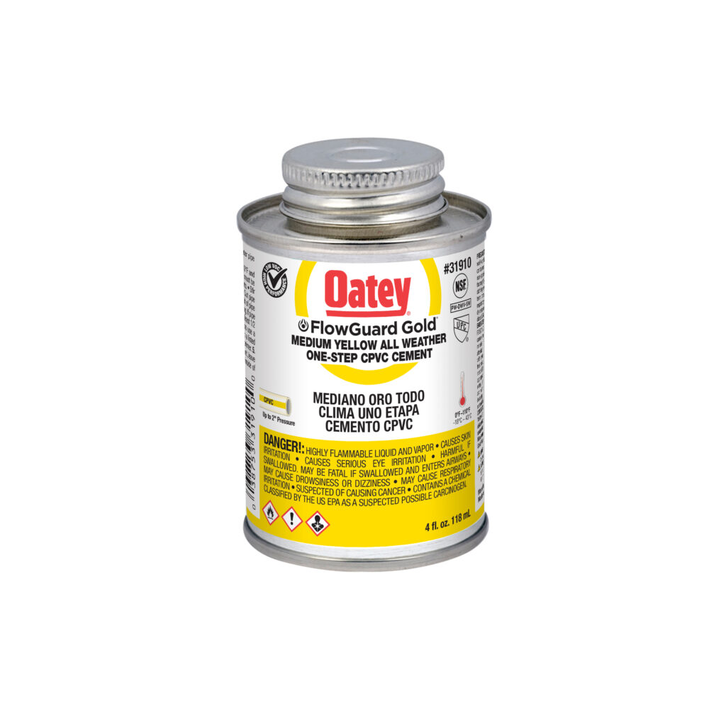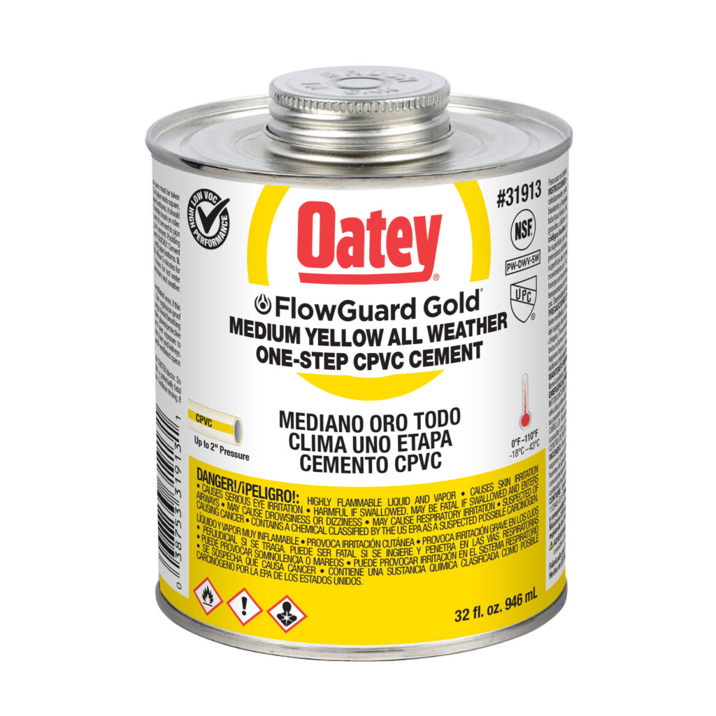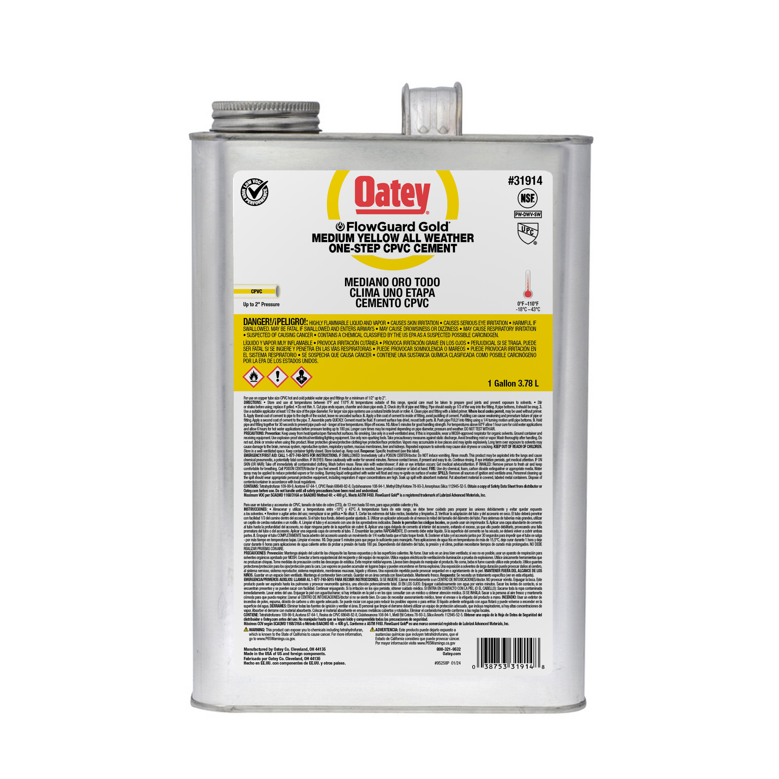 Le ciment jaune Oatey® FlowGuard Gold® 1-Step All Weather Fast Set est recommandé pour les systèmes d’eau froide et d’eau chaude jusqu’à 200 °F / 93 °C. Sa formule de prévention est conçue pour aider à protéger les tuyaux contre la corrosion. Sa formule de prévention est conçue pour aider à protéger les tuyaux de la corrosion. Son corps moyen possède d’excellentes propriétés de remplissage des espaces et est facile à appliquer grâce à la loupe incluse dans le couvercle. Cette colle jaune, à faible teneur en COV et à prise rapide peut être utilisée pour souder au solvant des tuyaux d’eau potable chaude et froide en CPVC et des raccords d’un diamètre allant jusqu’à 2 po avec ajustement serré. Les produits Oatey ont gagné la confiance des professionnels de la plomberie depuis plus de 100 ans.