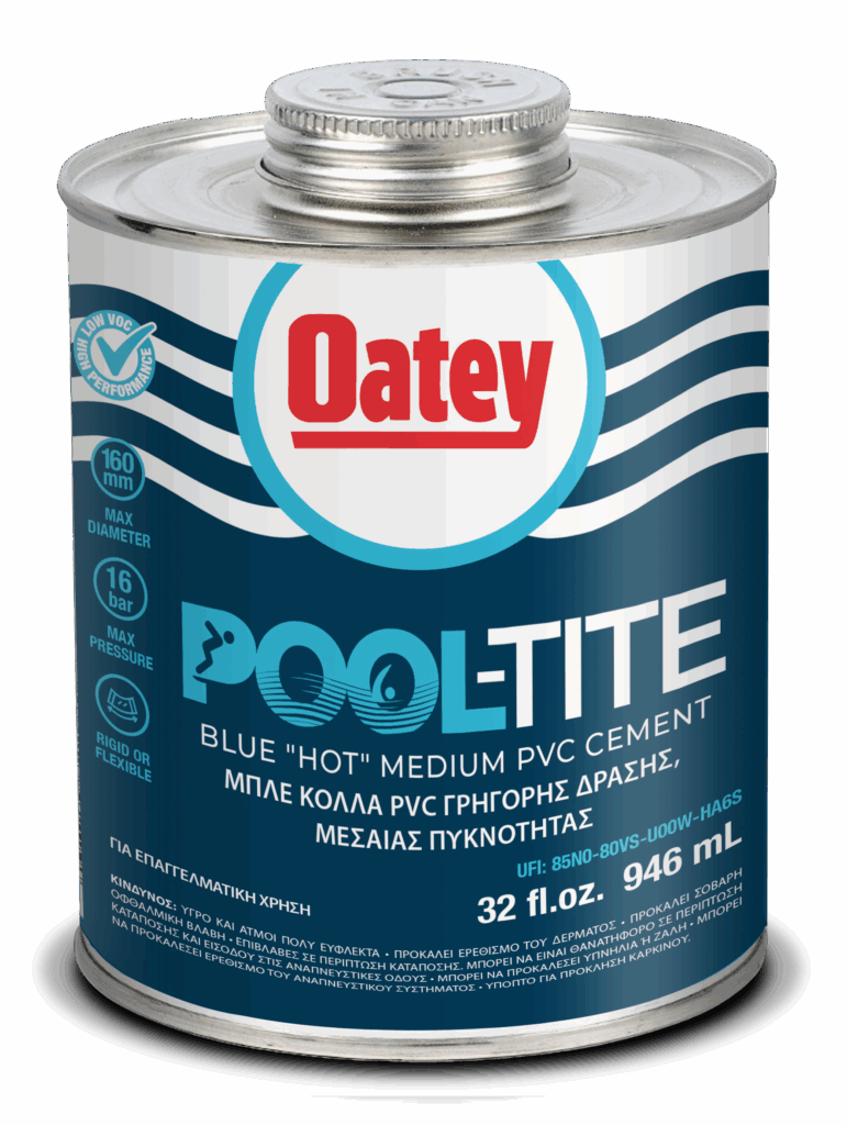 Le ciment bleu ” chaud ” Oatey® PVC 2300 Series Pool-Tite™ Medium Bodied Very Fast Set est recommandé pour l’eau potable, les tuyaux sous pression et les applications DWV. Il est formulé pour les conditions humides ou les situations impliquant une installation rapide ou une mise sous pression des tuyaux et raccords en PVC flexible et rigide. Les produits Oatey ont gagné la confiance des professionnels de la plomberie depuis plus de 100 ans.